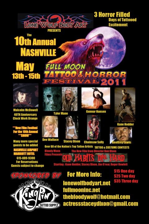 For the past ten years Ben Dixon (Lone Wolf Body Art, Dark Harvest 3) and his wife, actress Stacey Dixon, have been running the Full Moon Tattoo and Horror Convention in Nashville. This year they’ve added a horror film festival and named Dead Matter one of their first official selections. Both Brian Van Camp (Mark the Zombie), and Donna William (Rebecca – Trilec Labs) will be hosting the screening and Q&A (time TBD). Both will also be on-hand throughout the con (May 13-15) selling and signing Dead Matter DVDs, CDs, posters, and Mark the Zombie merch. For more information on the festival, click here.